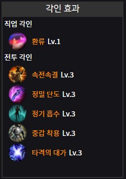 Lv.3 각인 5개만 채용하신다면, 환류, 속전속결, 정밀단도, 정기흡수, 중갑착용을 추천드립니다.
