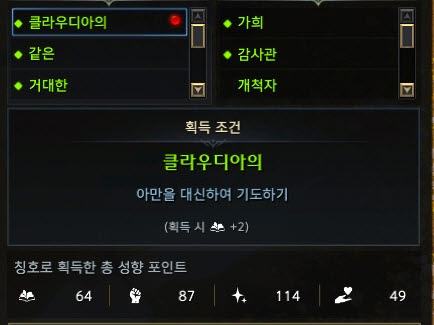 | 획득성향 | 호칭: 지성+2(클라우디아의), 호감도: 친철 +10, 지성+10 |