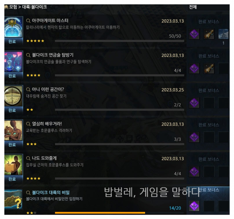 볼다이크에는 지난 플레체와 다르게 모험의서 등 새로운 수집 콘텐츠들이 등장했는데 우선 그것을 리뷰하기 전에 업적에 대해서 살펴보자.