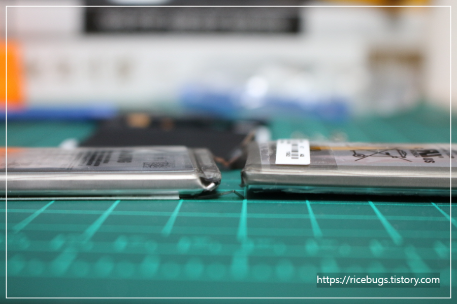 왼쪽이 새 배터리이고 오른쪽이 기존에 오래된 배터리이다.